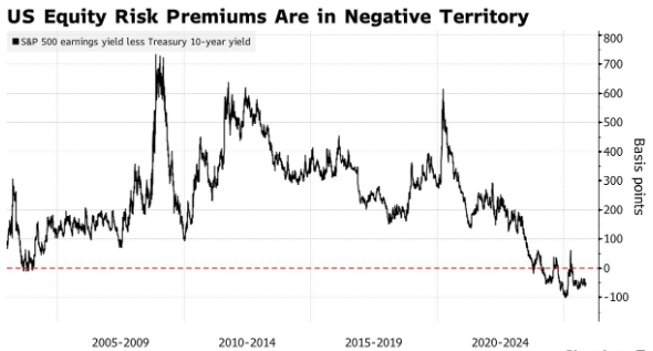 美国股票的权益风险溢价(即标普500 指数的盈利收益率与美国10 年期国债收益率之间的差值)已转为负值。计算显示,假设投资者通过短期借款来支撑其投资,并以与盈利收益率相符的收益来获取回报,那么美国股票在风险调整后的回报率实际上为零。