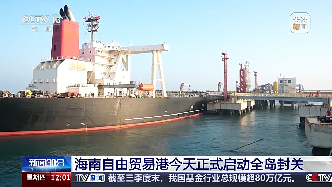 总台央视记者 孙艳:这里是海南自贸港“一线”放开的主通道洋浦港,我身后一艘搭载着17.9万吨石化原辅料的货船正缓缓靠港,这也是海南自贸港封关运作后的第一批“零关税”进口产品,海关快速验行,节省通关时间近4小时。