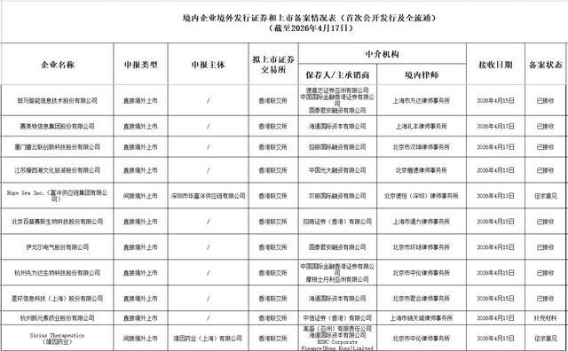 智通财经APP获悉股票金融配资,4月17日,中国证监会发布《境内企业境外发行证券和上市备案情况表(首次公开发行及全流通)(截至2026年4月17日)》。其中,赛美特、睿云联、瘦西湖文旅、百普赛斯(301080.SZ)、伊戈尔(002922.SZ)、先为达生物、星环科技(688031.SH)等拟香港IPO在中国证监会上市备案状态为"已接收"。Hope Sea、靖因药业拟香港IPO在中国证监会上市备案状态为"征求意见"。新元素药业拟香港IPO在中国证监会上市备案状态为"补充材料"。