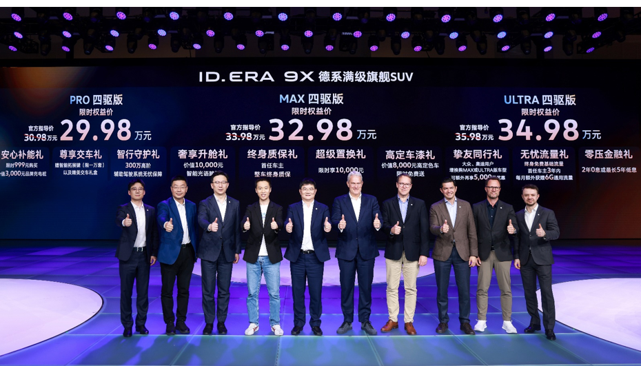 2026 北京车展现场,上汽大众全新旗舰 SUV ID. ERA 9X 正式迎来上市发布。新车推出 Pro、Max、Ultra 三款四驱版本实力配资平台,官方指导价30.98 万元 —35.98 万元,限时权益价29.98 万元 —34.98 万元(4 月 25 日 —5 月 31 日),同步推出多重上市尊享礼遇,以德系精工、全域满配、顶级智能,重新定义中大型旗舰增程 SUV 价值新标准。